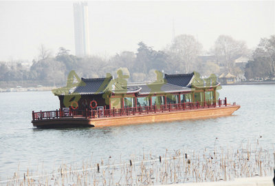 畫舫船就是裝飾古典華麗的游船,是"中國風"的仿古游船,結合古典園林建筑,體現了中華文明的古典藝術.畫舫船豪華而又古典,船上的建筑按照中國古代建筑里的亭臺樓閣,建筑工藝之復雜,要求之嚴格,仿古畫舫游船的特點飛檐翹角、玲瓏精致的四角亭子逐漸成形,赫然立于船頭,美人靠、盤龍柱子、彩畫……龍柱上的浮雕盤龍和祥云一層扣著一層,層層錯落有致,雕刻精細到盤龍身上的每一個鱗片都細細可數,古代皇家標志性元素,在畫舫船上體現的淋漓盡致。除了雕刻、花窗,整條船還有一個看點,那就是弧線優美、高高翹起的船尾。游船并不大,長約10米、寬3米,但是整體看起來堪稱一件藝術品。船尾的雕花欄桿與船艙、船頭的雕刻遙相呼應,船身四周貼著浮雕祥云,給整條船增添了富貴、華麗的氣質。